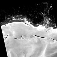 This thermal image from ASTER covers an area measuring 60 by 240 kilometers (37 by 147 miles), most of it over the Gulf of Mexico. The coldest surfaces appear dark, and the warmest appear white. The city of Pascagoula, Miss., is visible in the upper right corner; at night the land is colder (darker) than the Gulf waters. Offshore islands below Pascagoula also appear dark compared to the surrounding ocean. The black dots and patches over the Gulf waters are small clouds, particularly in the southern half of the image. The thickest parts of the oil spill appear as dark grey, filamentous masses in the southern part of the image, extending off the bottom. Other dark-light swirl patterns are water currents where different temperature water masses are visible.