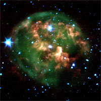 'Spitzer's infrared vision has revealed what could not be seen before - a massive ring of material that was expelled from the dying star,' said Dr. Joseph Hora, a Spitzer scientist at the Harvard-Smithsonian Center for Astrophysics, Cambridge, Mass. 'The composition of the ring and how it formed are mysteries we hope to address with further Spitzer studies.' The new picture is available online at http://photojournal.jpl.nasa.gov/catalog/PIA06755. The dying star is part of a 'planetary nebula' called NGC 246. When a star like our own Sun begins to run out of fuel, its core shrinks and heats up, boiling off the star's outer layers. Leftover material shoots outward, expanding in shells around the star. This ejected material is then bombarded with ultraviolet light from the central star's fiery surface, producing huge, glowing clouds - planetary nebulas - that look like giant jellyfish in space. These cosmic beauties last a relatively brief time, about a few thousand years, in the approximately 10-billion-year lifetime of a star. The name 'planetary nebula' came from early astronomers who thought the rounded clouds looked like planets. NGC 246 is located 1,800 light-years away in the Cetus constellation of our galaxy. Previous observations of this object by visible-light telescopes showed a glistening orb of gas and dust surrounding a central, compact star. By cutting through the envelope of dust with its infrared eyes, Spitzer provides a more transparent view through and behind the nebula. 'What we have seen with Spitzer is totally unexpected,' said Hora. 'Although previous observations showed the nebula had a patchy appearance, Spitzer has revealed a ring component of this dying star, possibly consisting of hydrogen molecules.' In the new false-color picture, the ring appears clumpy and red and off-center from the central star, while fluorescent, or ionized, gases are green. The central star is the left white spot in the middle of the cloud. Ultimately, these data will help astronomers better understand how planetary nebulas take shape, and how they nourish new generations of stars. A scientific paper on this and other planetary nebulas observed by Spitzer will be published on Sept. 1 in The Astrophysical Journal Supplement, along with 75 other papers reporting Spitzer early mission results. Launched August 25, 2003, the Spitzer Space Telescope is the fourth of NASA's Great Observatories, a program that also includes the Hubble Space Telescope, the Chandra X-ray Observatory and the Compton Gamma Ray Observatory. Spitzer is also part of NASA's Origins Program, which seeks to answer the questions: Where did we come from? Are we alone? The Jet Propulsion Laboratory, Pasadena, Calif., manages the Spitzer Space Telescope mission for NASA's Science Mission Directorate, Washington, D.C. Science operations are conducted at the Spitzer Science Center at the California Institute of Technology in Pasadena. JPL is a division of Caltech. Spitzer's infrared array camera, which took the new picture of NGC 246, was built by NASA Goddard Space Flight Center, Greenbelt, Md. The camera's development was led by Dr. Giovanni Fazio of Harvard-Smithsonian Center for Astrophysics.