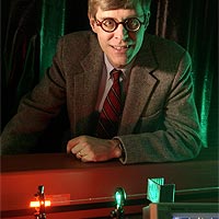 Confused? You're not alone. 'I've had some of the world's experts scratching their heads over this one,' says Robert Boyd, the M. Parker Givens Professor of Optics at the University of Rochester. 'Theory predicted that we could send light backwards, but nobody knew if the theory would hold up or even if it could be observed in laboratory conditions.' Boyd recently showed how he can slow down a pulse of light to slower than an airplane, or speed it up faster than its breakneck pace, using exotic techniques and materials. But he's now taken what was once just a mathematical oddity—negative speed—and shown it working in the real world. 'It's weird stuff,' says Boyd. 'We sent a pulse through an optical fiber, and before its peak even entered the fiber, it was exiting the other end. Through experiments we were able to see that the pulse inside the fiber was actually moving backward, linking the input and output pulses.' So, wouldn't Einstein shake a finger at all these strange goings-on? After all, this seems to violate Einstein's sacred tenet that nothing can travel faster than the speed of light. 'Einstein said information can't travel faster than light, and in this case, as with all fast-light experiments, no information is truly moving faster than light,' says Boyd. 'The pulse of light is shaped like a hump with a peak and long leading and trailing edges. The leading edge carries with it all the information about the pulse and enters the fiber first. By the time the peak enters the fiber, the leading edge is already well ahead, exiting. From the information in that leading edge, the fiber essentially 'reconstructs' the pulse at the far end, sending one version out the fiber, and another backward toward the beginning of the fiber.' Boyd is already working on ways to see what will happen if he can design a pulse without a leading edge. Einstein says the entire faster-than-light and reverse-light phenomena will disappear. Boyd is eager to put Einstein to the test. So How Does Light Go Backwards? Boyd, along with Rochester graduate students George M. Gehring and Aaron Schweinsberg, and undergraduates Christopher Barsi of Manhattan College and Natalie Kostinski of the University of Michigan, sent a burst of laser light through an optical fiber that had been laced with the element erbium. As the pulse exited the laser, it was split into two. One pulse went into the erbium fiber and the second traveled along undisturbed as a reference. The peak of the pulse emerged from the other end of the fiber before the peak entered the front of the fiber, and well ahead of the peak of the reference pulse. But to find out if the pulse was truly traveling backward within the fiber, Boyd and his students had to cut back the fiber every few inches and re-measure the pulse peaks when they exited each pared-back section of the fiber. By arranging that data and playing it back in a time sequence, Boyd was able to depict, for the first time, that the pulse of light was moving backward within the fiber. To understand how light's speed can be manipulated, think of a funhouse mirror that makes you look fatter. As you first walk by the mirror, you look normal, but as you pass the curved portion in the center, your reflection stretches, with the far edge seeming to leap ahead of you (the reference walker) for a moment. In the same way, a pulse of light fired through special materials moves at normal speed until it hits the substance, where it is stretched out to reach and exit the material's other side [See 'fast light' animation]. Conversely, if the funhouse mirror were the kind that made you look skinny, your reflection would appear to suddenly squish together, with the leading edge of your reflection slowing as you passed the curved section. Similarly, a light pulse can be made to contract and slow inside a material, exiting the other side much later than it naturally would [See 'slow light' animation]. To visualize Boyd's reverse-traveling light pulse, replace the mirror with a big-screen TV and video camera. As you may have noticed when passing such a display in an electronics store window, as you walk past the camera, your on-screen image appears on the far side of the TV. It walks toward you, passes you in the middle, and continues moving in the opposite direction until it exits the other side of the screen. A negative-speed pulse of light acts much the same way. As the pulse enters the material, a second pulse appears on the far end of the fiber and flows backward. The reversed pulse not only propagates backward, but it releases a forward pulse out the far end of the fiber. In this way, the pulse that enters the front of the fiber appears out the end almost instantly, apparently traveling faster than the regular speed of light. To use the TV analogy again—it's as if you walked by the shop window, saw your image stepping toward you from the opposite edge of the TV screen, and that TV image of you created a clone at that far edge, walking in the same direction as you, several paces ahead [See 'backward light' animation]. 'I know this all sounds weird, but this is the way the world works,' says Boyd. News Story Origin and Copyright: Rochester : http://www.rochester.edu Original news release: http://www.rochester.edu/news/show.php?id=2544 For more physics & astronomy stories like this one, go to: physlink.com |