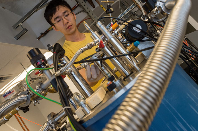 In a new study, U.S. and Austrian physicists have observed quantum entanglement among “billions of billions” of flowing electrons in a quantum critical material. The research, which appears this week in Science, examined the electronic and magnetic behavior of a “strange metal” compound of ytterbium, rhodium and silicon as it both neared and passed through a critical transition at the boundary between two well-studied quantum phases. The study at Rice University and Vienna University of Technology (TU Wien) provides the strongest direct evidence to date of entanglement’s role in bringing about quantum criticality, said study co-author Qimiao Si of Rice. “When we think about quantum entanglement, we think about small things,” Si said. “We don’t associate it with macroscopic objects. But at a quantum critical point, things are so collective that we have this chance to see the effects of entanglement, even in a metallic film that contains billions of billions of quantum mechanical objects.” Si, a theoretical physicist and director of the Rice Center for Quantum Materials (RCQM), has spent more than two decades studying what happens when materials like strange metals and high-temperature superconductors change quantum phases. Better understanding such materials could open the door to new technologies in computing, communications and more. The international team overcame several challenges to get the result. TU Wien researchers developed a highly complex materials synthesis technique to produce ultrapure films containing one part ytterbium for every two parts rhodium and silicon (YbRh2Si2). At absolute zero temperature, the material undergoes a transition from one quantum phase that forms a magnetic order to another that does not. At Rice, study co-lead author Xinwei Li, then a graduate student in the lab of co-author and RCQM member Junichiro Kono, performed terahertz spectroscopy experiments on the films at temperatures as low as 1.4 Kelvin. The terahertz measurements revealed the optical conductivity of the YbRh2Si2 films as they were cooled to a quantum critical point that marked the transition from one quantum phase to another. “With strange metals, there is an unusual connection between electrical resistance and temperature,” said corresponding author Silke Bühler-Paschen of TU Wien’s Institute for Solid State Physics. “In contrast to simple metals such as copper or gold, this does not seem to be due to the thermal movement of the atoms, but to quantum fluctuations at the absolute zero temperature.” To measure optical conductivity, Li shined coherent electromagnetic radiation in the terahertz frequency range on top of the films and analyzed the amount of terahertz rays that passed through as a function of frequency and temperature. The experiments revealed “frequency over temperature scaling,” a telltale sign of quantum criticality, the authors said. Kono, an engineer and physicist in Rice’s Brown School of Engineering, said the measurements were painstaking for Li, who’s now a postdoctoral researcher at the California Institute of Technology. For example, only a fraction of the terahertz radiation shined onto the sample passed through to the detector, and the important measurement was how much that fraction rose or fell at different temperatures. Former Rice University graduate student Xinwei Li in 2016 with the terahertz spectrometer he later used to measure entanglement in the conduction electrons flowing through a “strange metal” compound of ytterbium, rhodium and silicon. (Photo by Jeff Fitlow/Rice University) “Less than 0.1% of the total terahertz radiation was transmitted, and the signal, which was the variation of conductivity as a function of frequency, was a further few percent of that,” Kono said. “It took many hours to take reliable data at each temperature to average over many, many measurements, and it was necessary to take data at many, many temperatures to prove the existence of scaling. “Xinwei was very, very patient and persistent,” Kono said. “In addition, he carefully processed the huge amounts of data he collected to unfold the scaling law, which was really fascinating to me.” Making the films was even more challenging. To grow them thin enough to pass terahertz rays, the TU Wien team developed a unique molecular beam epitaxy system and an elaborate growth procedure. Ytterbium, rhodium and silicon were simultaneously evaporated from separate sources in the exact 1-2-2 ratio. Because of the high energy needed to evaporate rhodium and silicon, the system required a custom-made ultrahigh vacuum chamber with two electron-beam evaporators. “Our wild card was finding the perfect substrate: germanium,” said TU Wien graduate student Lukas Prochaska, a study co-lead author. The germanium was transparent to terahertz, and had “certain atomic distances (that were) practically identical to those between the ytterbium atoms in YbRh2Si2, which explains the excellent quality of the films,” he said. Si recalled discussing the experiment with Bühler-Paschen more than 15 years ago when they were exploring the means to test a new class of quantum critical point. The hallmark of the quantum critical point that they were advancing with co-workers is that the quantum entanglement between spins and charges is critical. “At a magnetic quantum critical point, conventional wisdom dictates that only the spin sector will be critical,” he said. “But if the charge and spin sectors are quantum-entangled, the charge sector will end up being critical as well.” At the time, the technology was not available to test the hypothesis, but by 2016, the situation had changed. TU Wien could grow the films, Rice had recently installed a powerful microscope that could scan them for defects, and Kono had the terahertz spectrometer to measure optical conductivity. During Bühler-Paschen’s sabbatical visit to Rice that year, she, Si, Kon